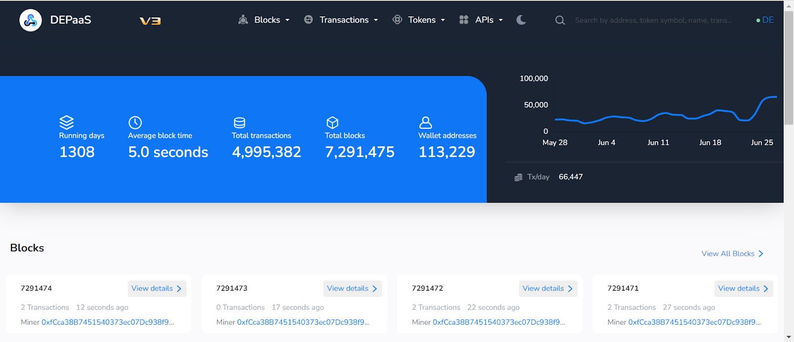 Based on publicly available information from the official website, we can see that DEchain has been operational for 1308 days, with an average block production time of 5 seconds, resulting in 7,291,486 blocks generated and 113,229 wallet addresses. DEchain operates continuously and stably.