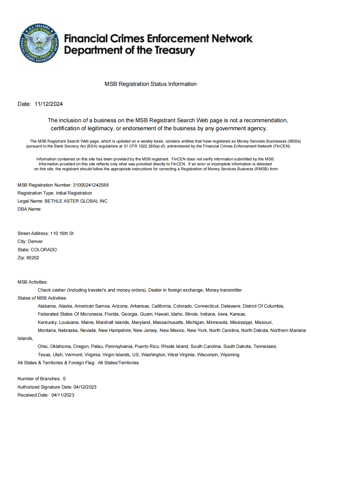 ✅: BETHLE ASTER GLOBAL INC has obtained the MSB (Money Services Business) license issued by the US Treasury Department FinCEN, and has the qualifications to legally operate virtual currency trading services in the United States!