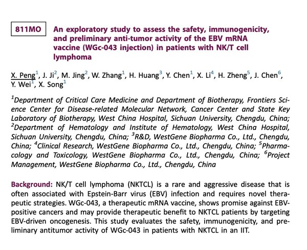 BARCELONA,Spain,Sept. 17,2024 --WestGene Biopharma,a leading innovator in mRNA therapeutics,presented the latest clinical data for its EBV-positive tumour mRNA vaccine,WGc-043,during a mini-oral presentation at the European Society for Medical Oncology (ESMO) Congress 2024.