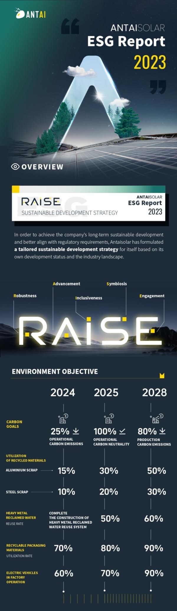 XIAMEN,China,Dec. 20,2024 -- Antaisolar,expert in digital intelligent PV mounting system solutions,has officially published its first Environmental,Social,and Governance (ESG) report,marking a significant step in its commitment to sustainable development. The report outlines Antaisolar's ESG vision,achievements,and future objectives,centered on its newly unveiled「RAISE」sustainable development strategy,which aligns seamlessly with their slogan,"RAISE a Green World".