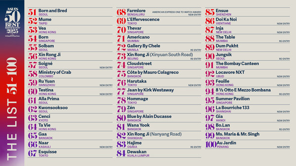 ASIA'S 50 BEST RESTAURANTS UNVEILS THE ESTABLISHMENTS VOTED ONTO THE EXTENDED 51 - 100 LIST FOR 2025