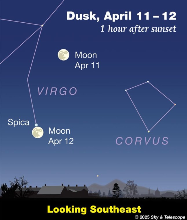 Look to the left of the moon to find Spica tonight. Tomorrow,they will still both be visible,but will have switched positions.