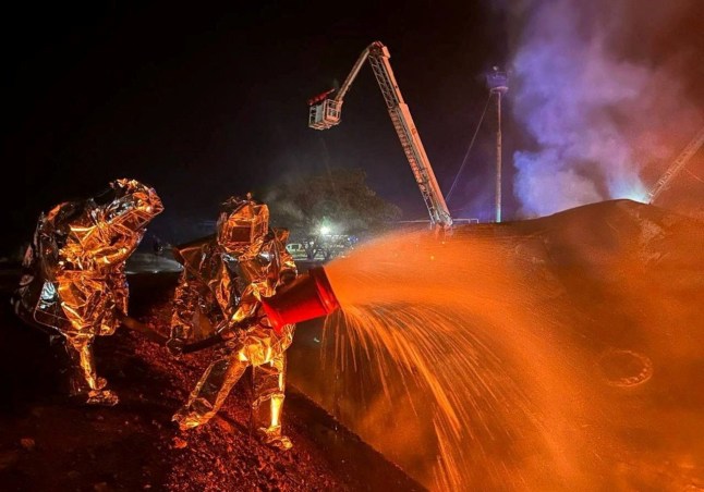 Firefighters work at the site of a fuel storage facility hit by a Russian drone strike on the southern Ukrainian region of Odesa (Picture: Reuters)