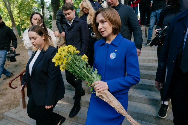 President Maia Sandu was given flowers when she left the polling station (Picture: Getty)