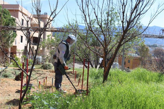 From a hilltop in the southern village of Kfarmelki,15 miles from the border with Israel,Metro watches as deminers in blast-resistant armour,carrying metal detectors,move from one patch to another.
